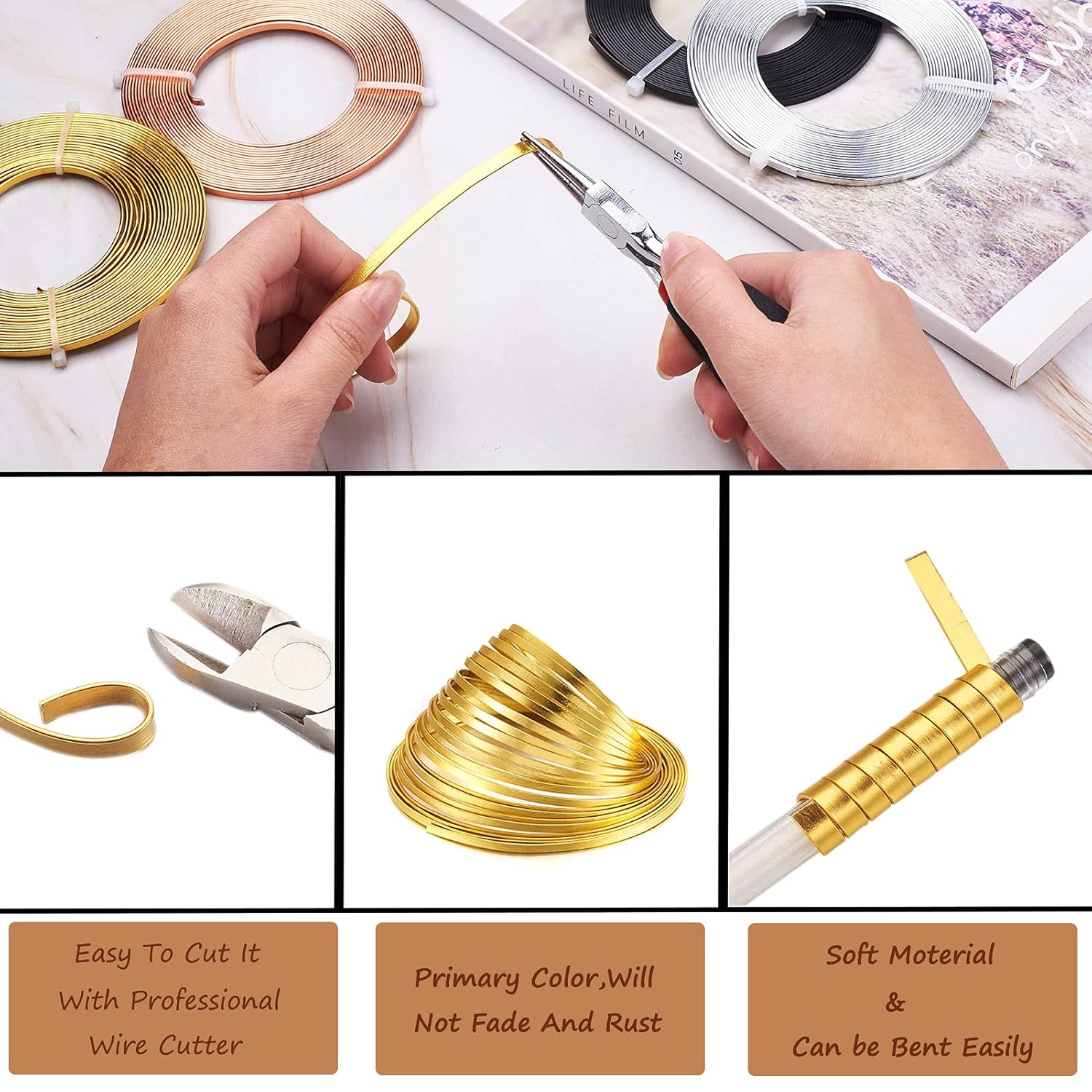 - ăPremium MaterialăCrafting wire is made of malleable yet durable aluminium, perfect for wrapping, bending, and shaping. It can be easily hammered and stamped. They feature with 4 rich colors for selection, the bright and fine anodized color does not flake off when being bent or smashed as long as coated tools are used.