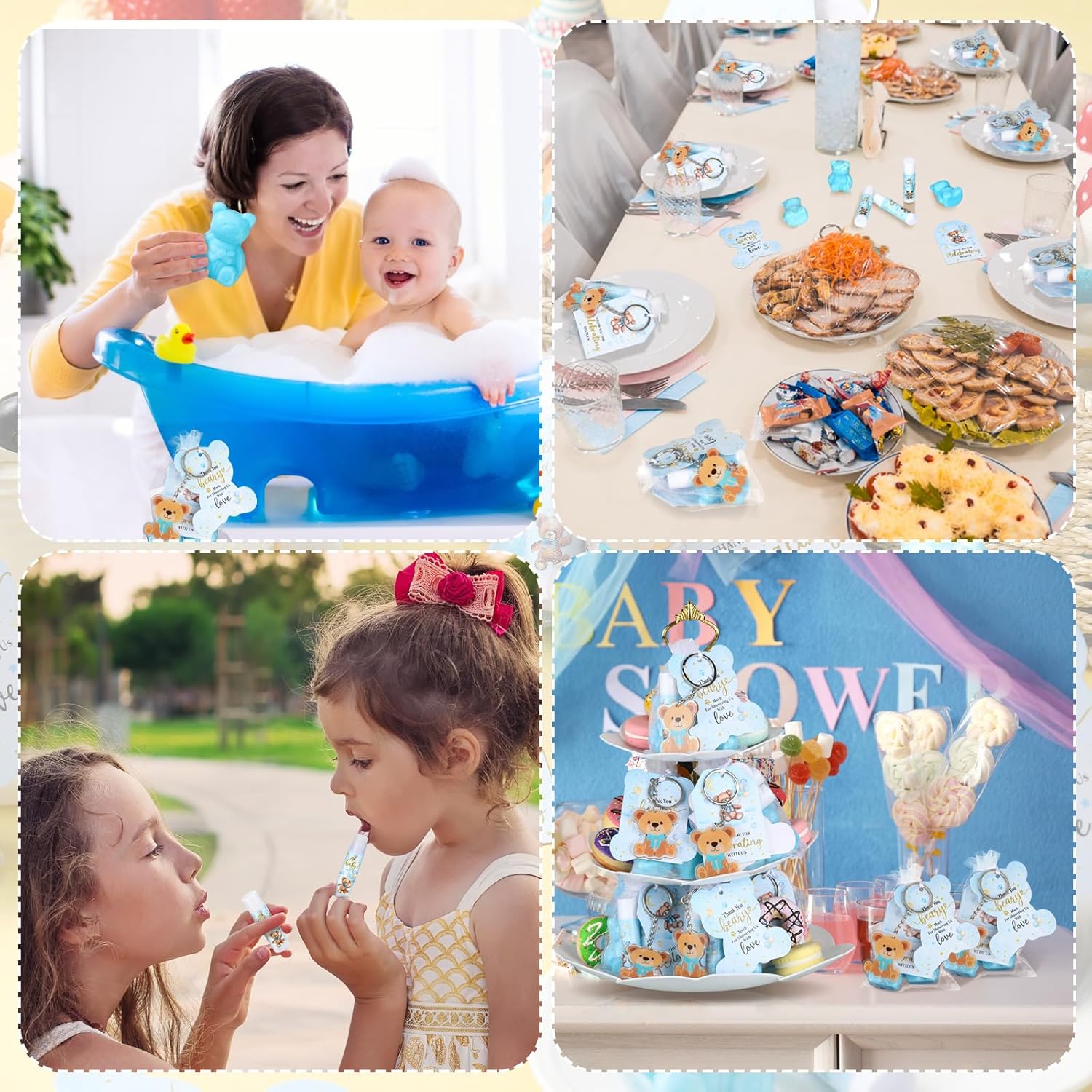 - Complete Baby Shower Favor Sets: enjoy a comprehensive baby shower favors set that are suitable for a baby shower; Each package includes 48 lip balms, 48 bear shaped soaps, 48 bear keychains, 48 organza bags, 48 thank you tags, and 48 bear shaped cards; These can be individually packaged in organza bags alongside a thank you tag, offering a sophisticated and heartfelt gesture to appreciate your guests