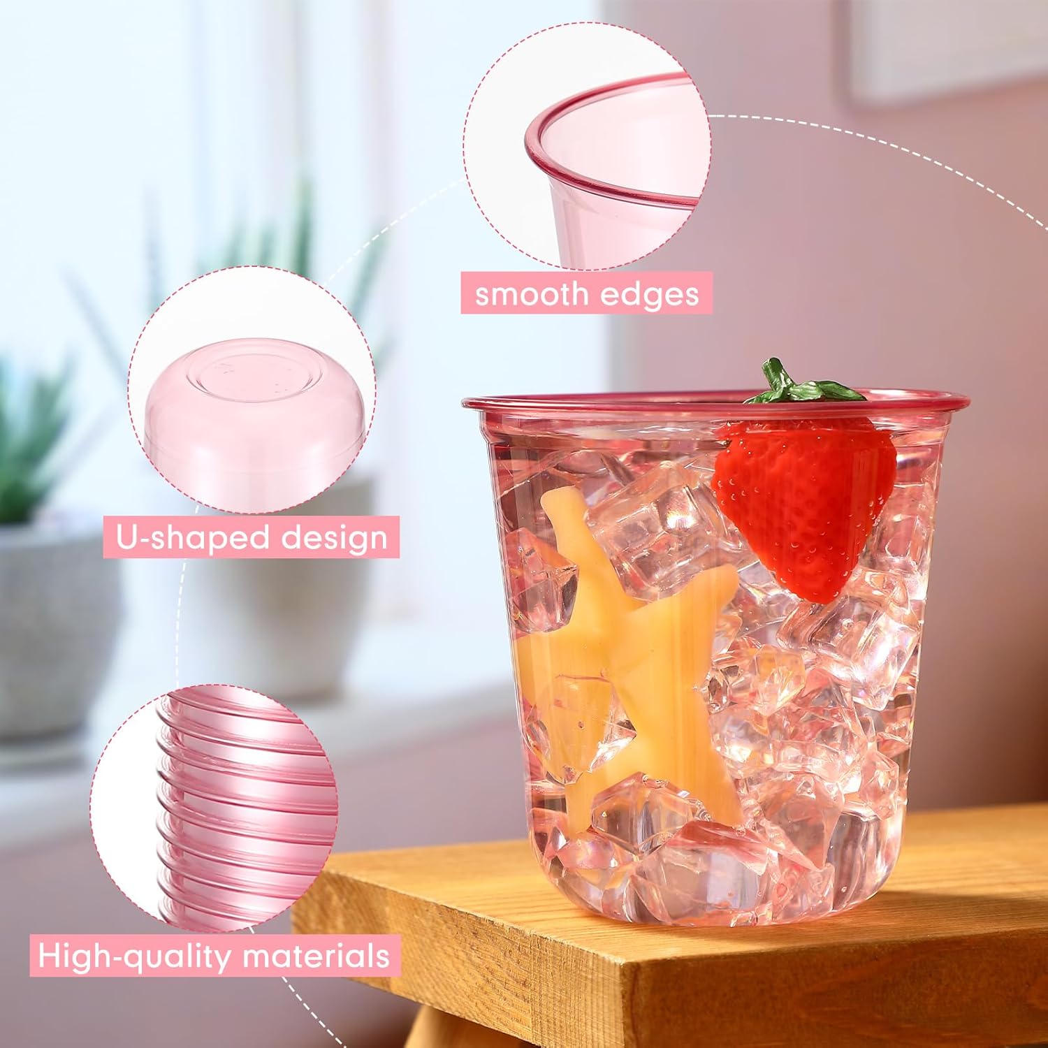100 Pcs Disposable Stemless Glasses 12oz Crystal Plastic Wine Glasses Clear Classic Pet Cup for Meeting Weddings Birthdays Cocktail Christmas Party Supplies (Pink)