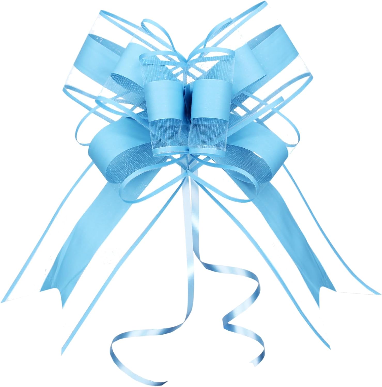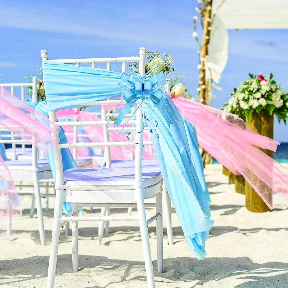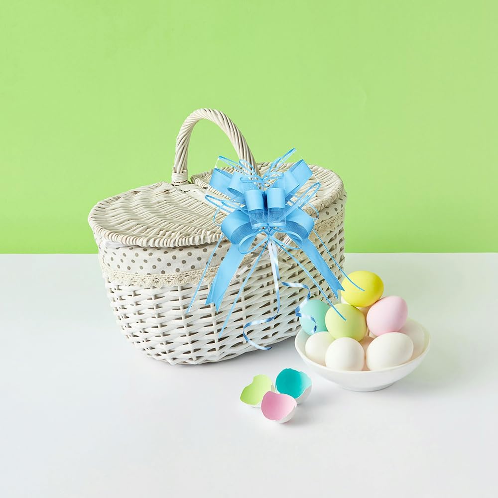 - Package: Each pack contains 10 large gift bows, and their assembled diameter is 8 inch. Our gift bows for presents are made of high quality materials and designed with blue lines accented on the organza to make your gifts truly stand out with our versatile and user-friendly pull bows!