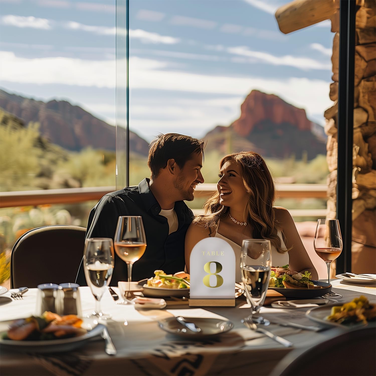 Wedding Table Numbers 1-10, Acrylic Arch Signs with Natural Wood Stands Holders, Rustic Table Decor for Reception & Parties (Frosted Gold)