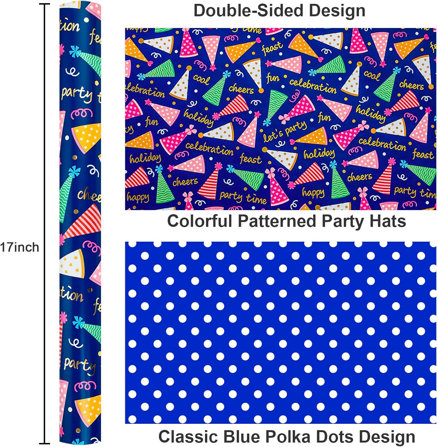 - Kid Festive Wrapping Paper: Bright and cheerful party hat patterns with phrases like "celebration" and "fun" on a rich navy blue background, elegant blue polka dot design on reverse, adding a festive touch to any gift.