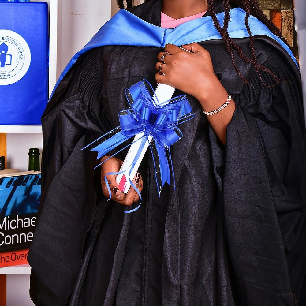 - Package: Each package include 15 pull bows, and their assembled diameter is 6 inch. Our gift wrap bows are made of high quality materials and designed with blue lines accented on the organza to make the bow look elegant and charming