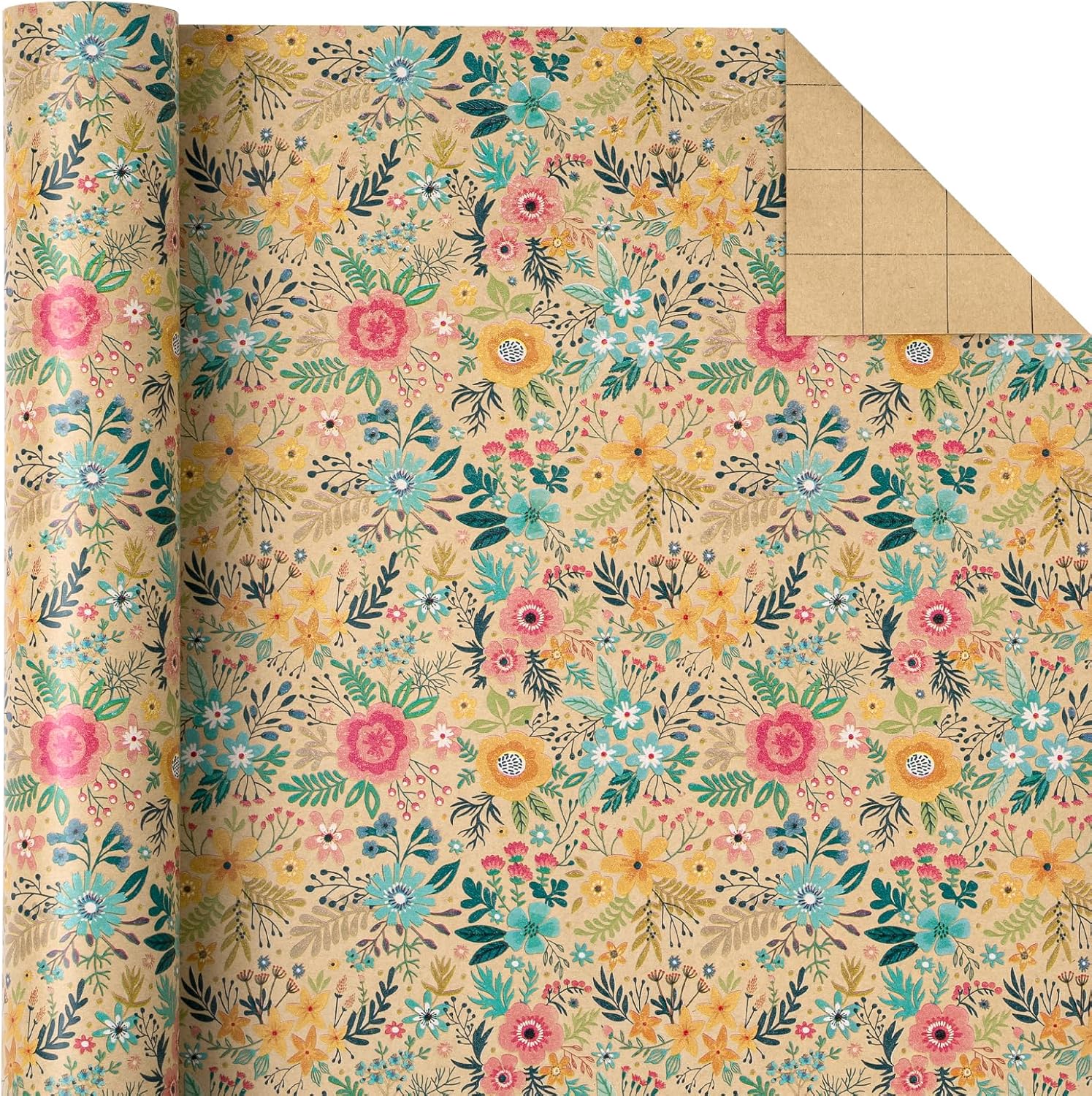 WRAPAHOLIC Kraft Floral Wrapping Paper Roll - Mini Roll - 17 Inch x 33 Feet - Spring Summer Garden Flower Design Perfect for Wedding, Bridal Shower, Birthday