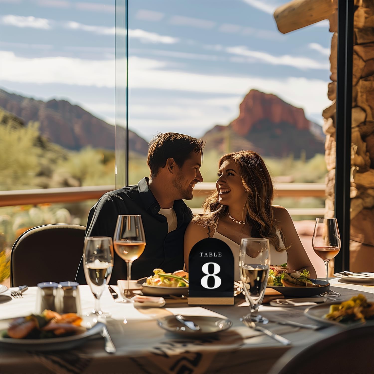 - Elevate Your Event- Our Black table numbers feature high-quality acrylic sheets and natural wood stands. Add a touch of elegance and sophistication to your event with these exquisite table numbers.