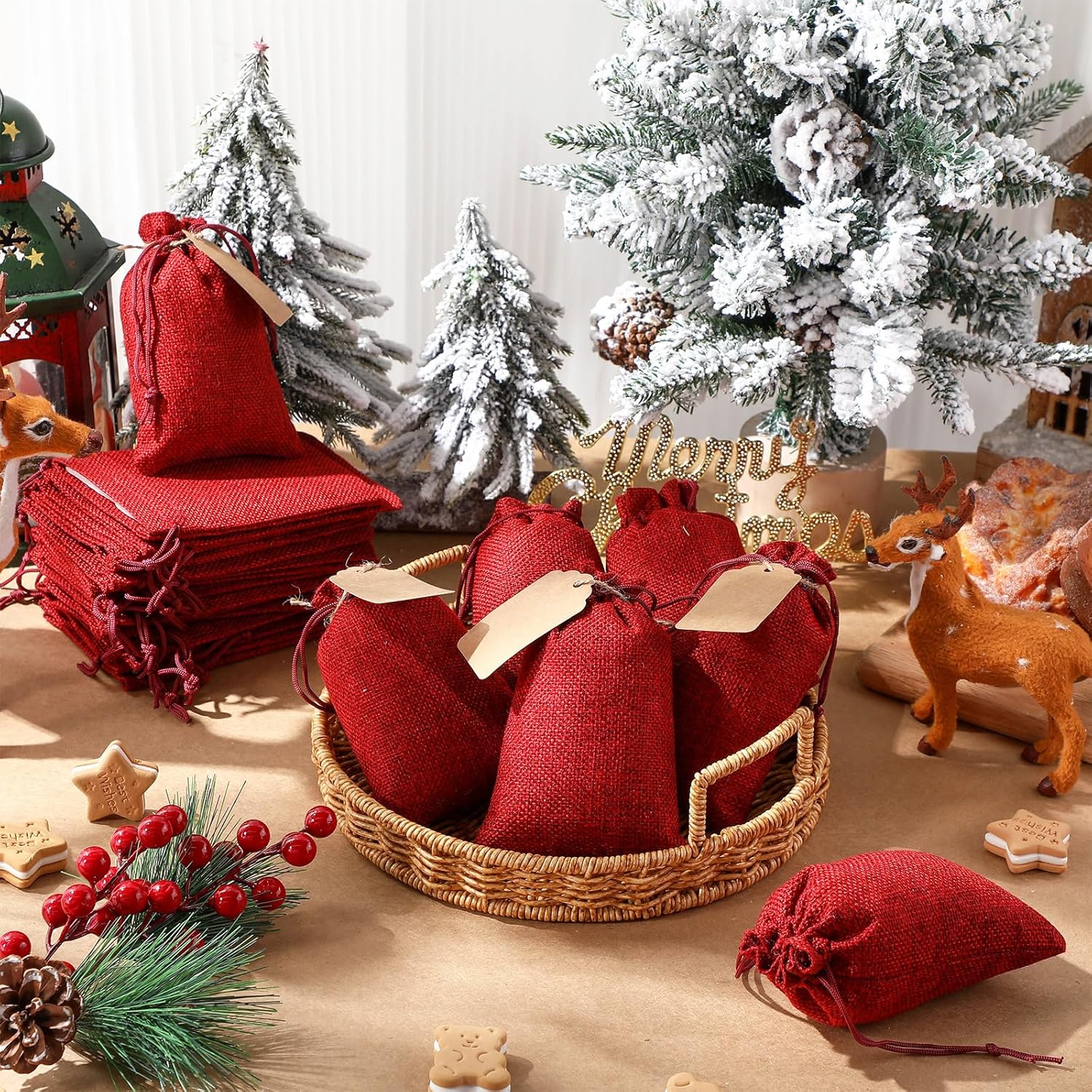 - Included Components : 100 Pcs Burlap Gift Bags, 100 Pcs Gift Tags, 1 Bundle Hemp Rope, 10 Pcs Red Gift Bags
