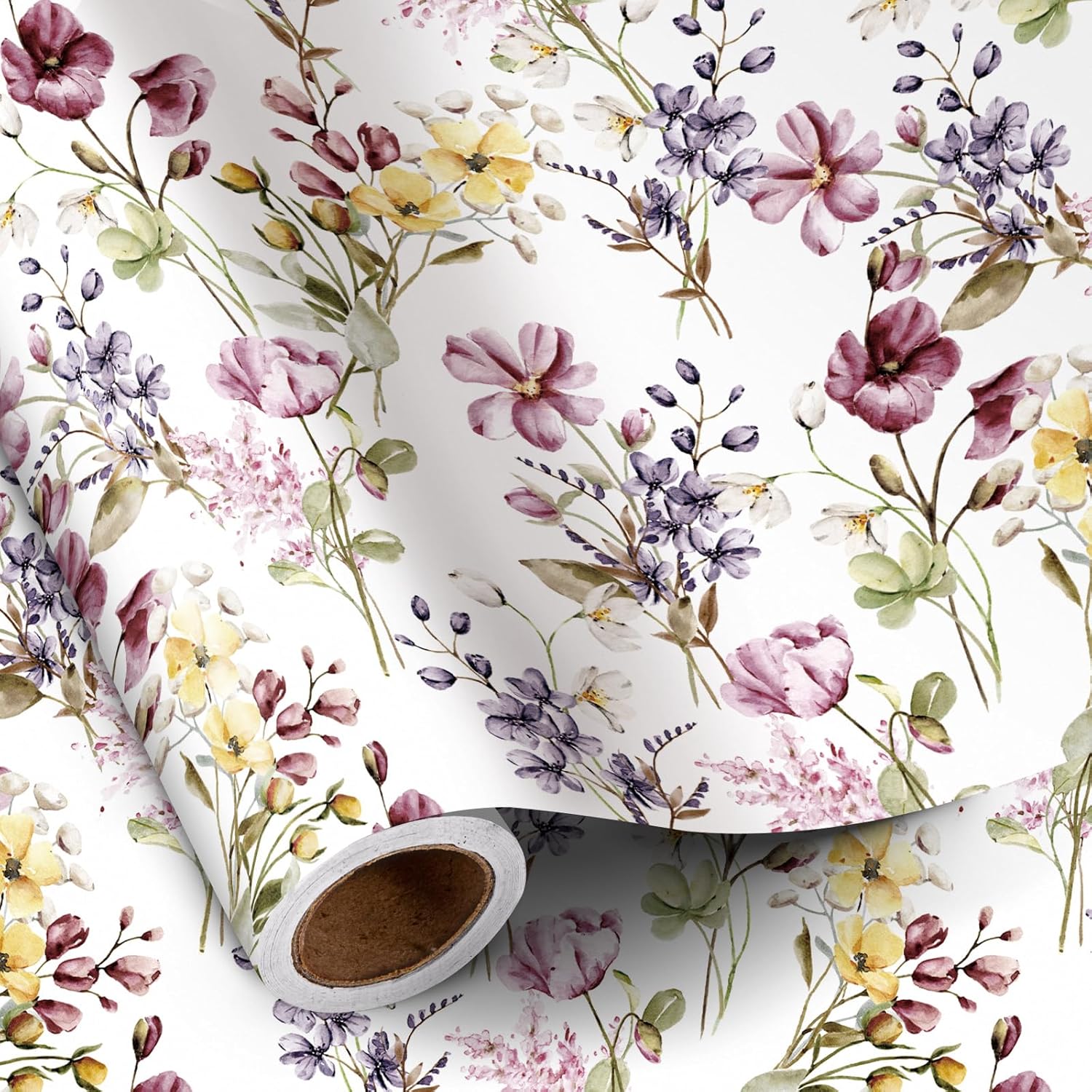 - Elegant Floral Wrapping Paper: Featuring watercolor flowers in soft pink, yellow and purple hues, paired with delicate subtle green leaves, this wrapping paper adds a romantic and charming touch to your gifts