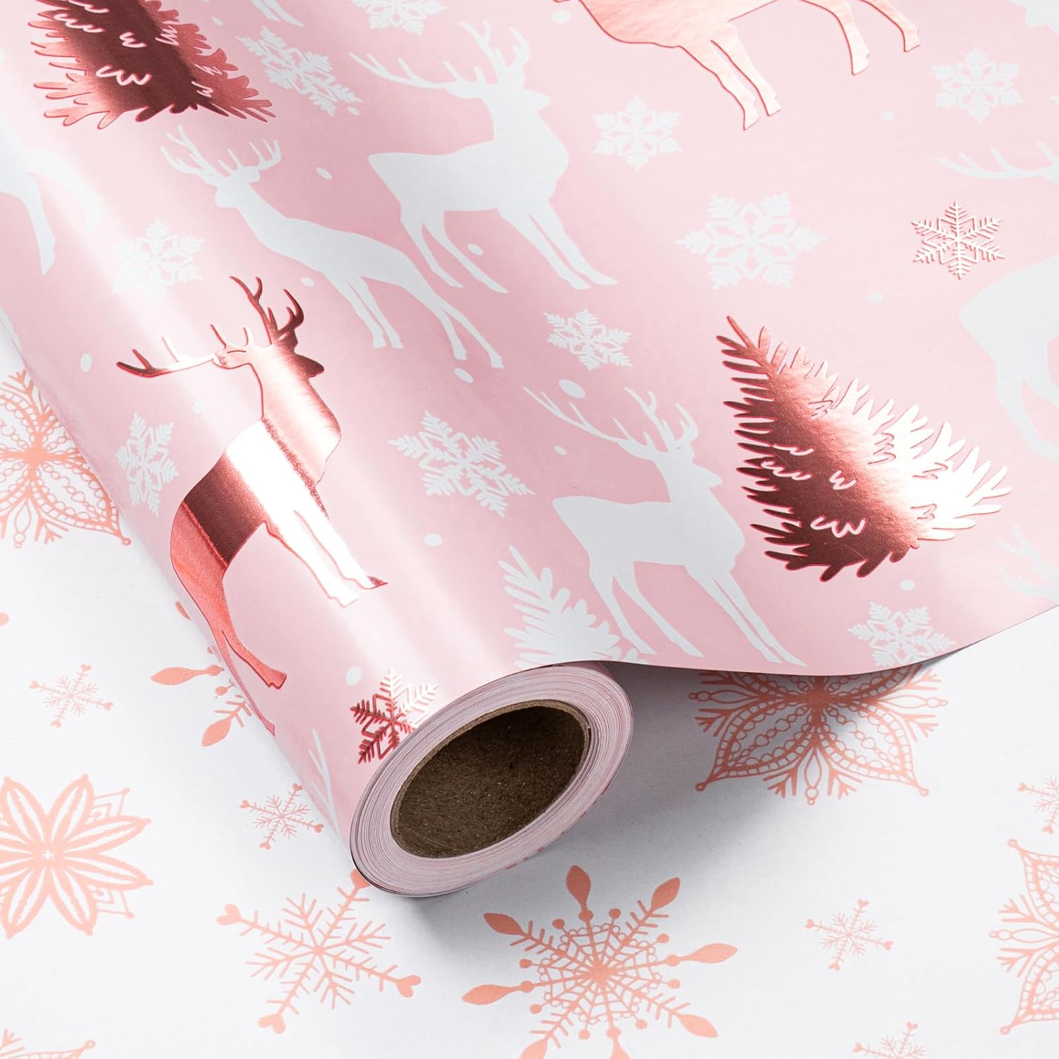 LeZakaa Christmas Pink Wrapping Paper Jumbo Roll, Reindeer & Snowflake, Metallic Foil, Rose Gold Foil Reversible Design for Festive Winter Holiday, Family Gathering, 30 inches x 100 Feet