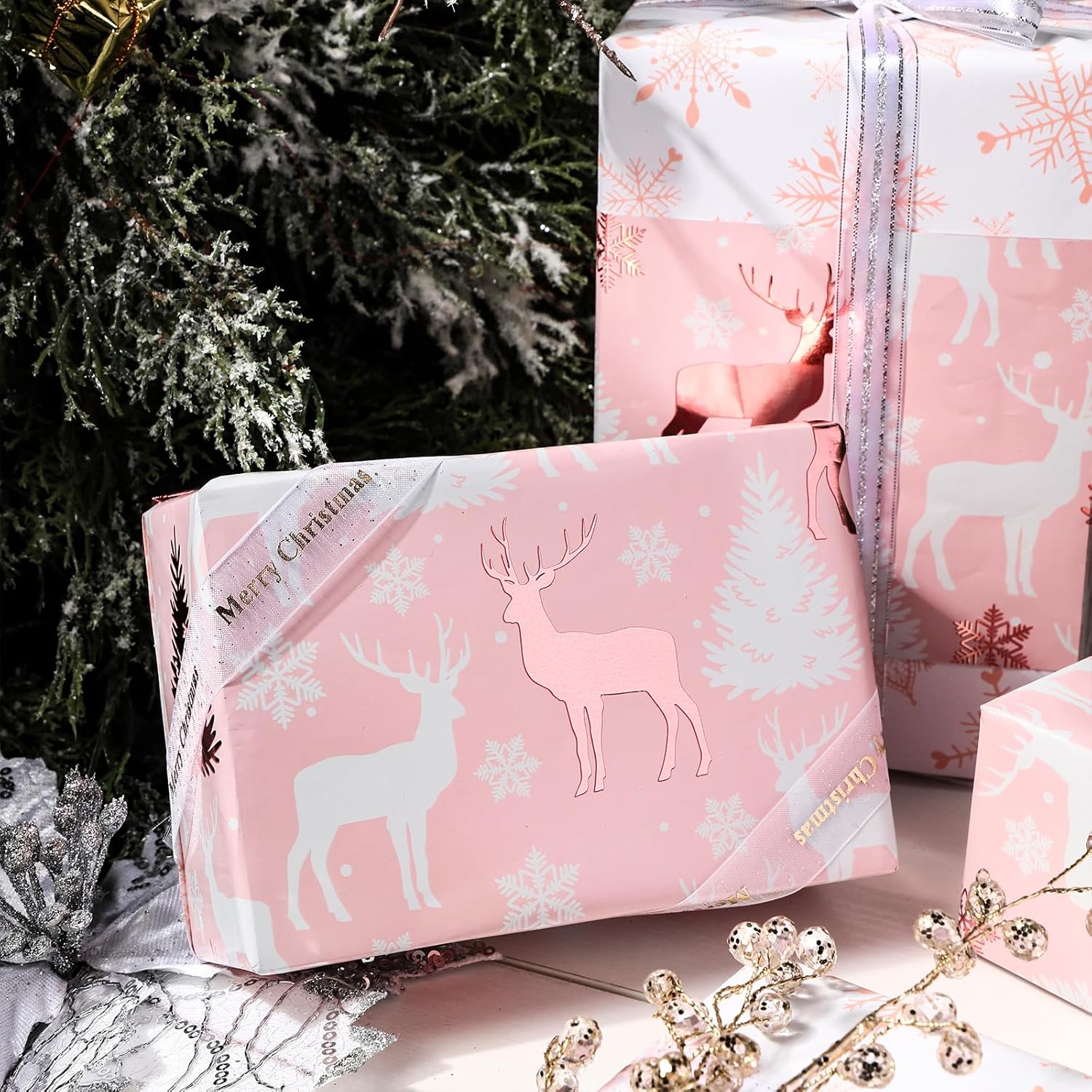 - Double-Sided Festive Design with Metallic Foil: One side shows reindeer silhouettes, Christmas trees, and snowflake accents in rose gold foil on a pink background; reverse side features rose gold foil snowflakes on a white background for versatile looks.