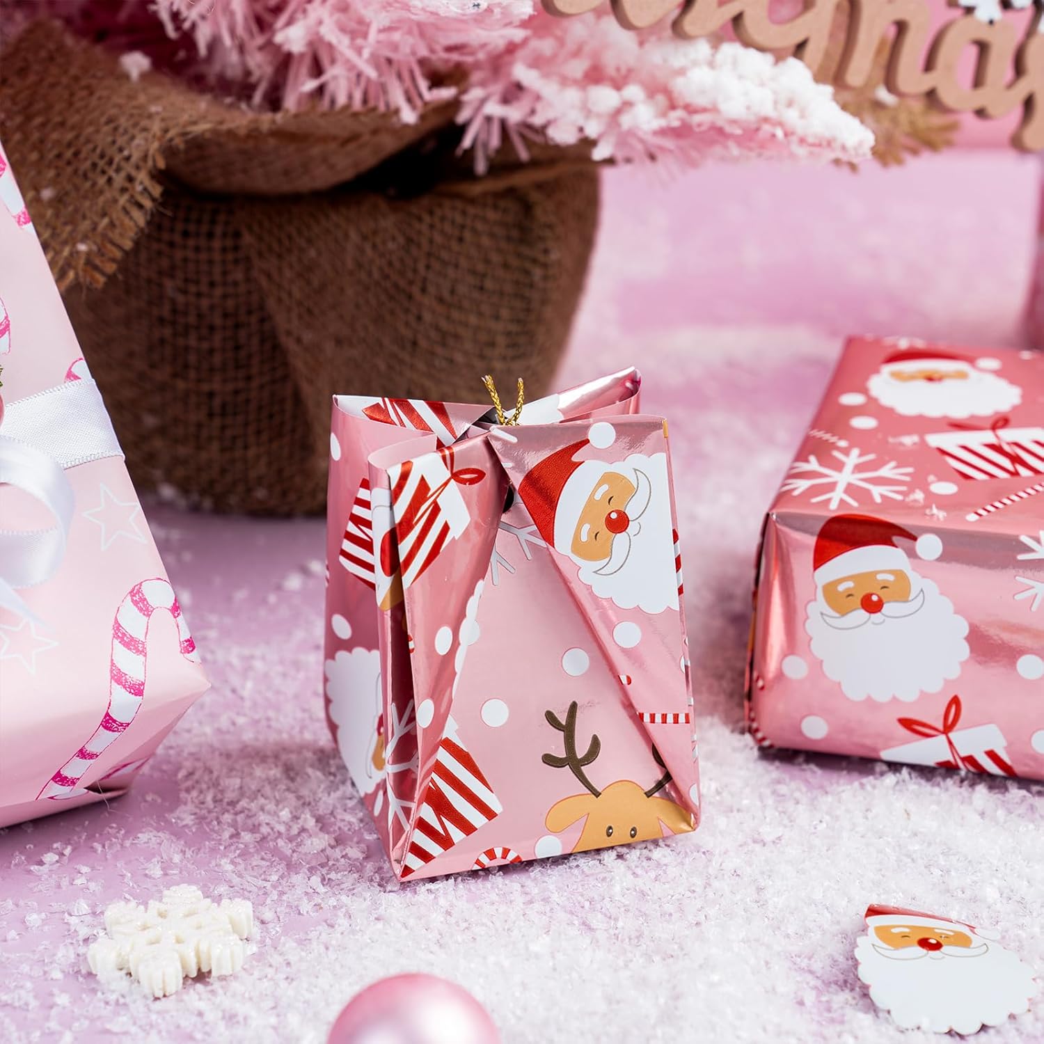 LeZakaa Christmas Pink Wrapping Paper Jumbo Roll, Santa Claus & Candy Cane, Metallic Foil, Rose Gold Foil Reversible Design for Festive Winter Holiday, Family Gathering, 30 inches x 32.8 Feet
