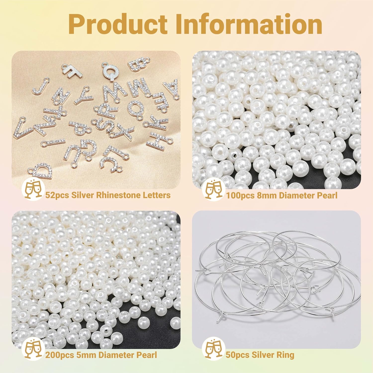- DIY Wine Charms Kit: Includes 52 silver rhinestone letter beads + 50 silver-tone hoops, paired with 300 pearl pendants (approx. 200 pcs 0.2-inch + 100 pcs 0.3-inch) for sparkling brilliance. Spell names or initials to create personalized drinkware accessories