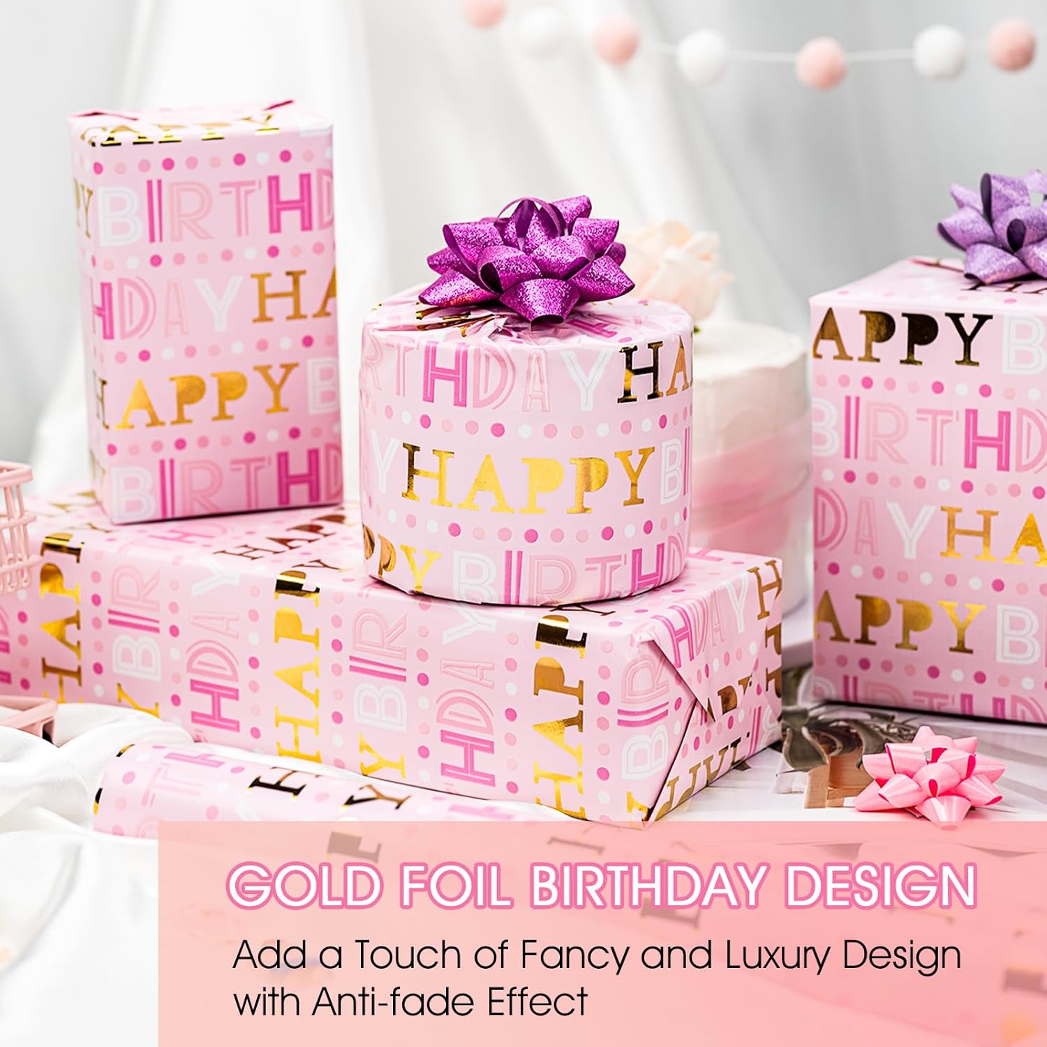 - Pink Birthday Wrapping Paper: Make her birthday extra special with this charming pink birthday wrapping paper featuring festive "HAPPY BIRTHDAY" lettering in vibrant shades and shimmering gold foil. Perfect for little girl wrapping paper needs or any birthday that calls for a sweet pink touch