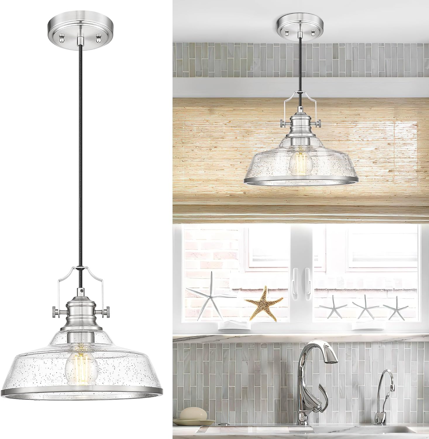 kudos Brushed Nickel Pendant Lights Kitchen Island, Large Pendant Light with Seeded Glass, Industrial Hanging Lighting for Kitchen Sink Dining Room Bathroom,KDPL13-BN-S