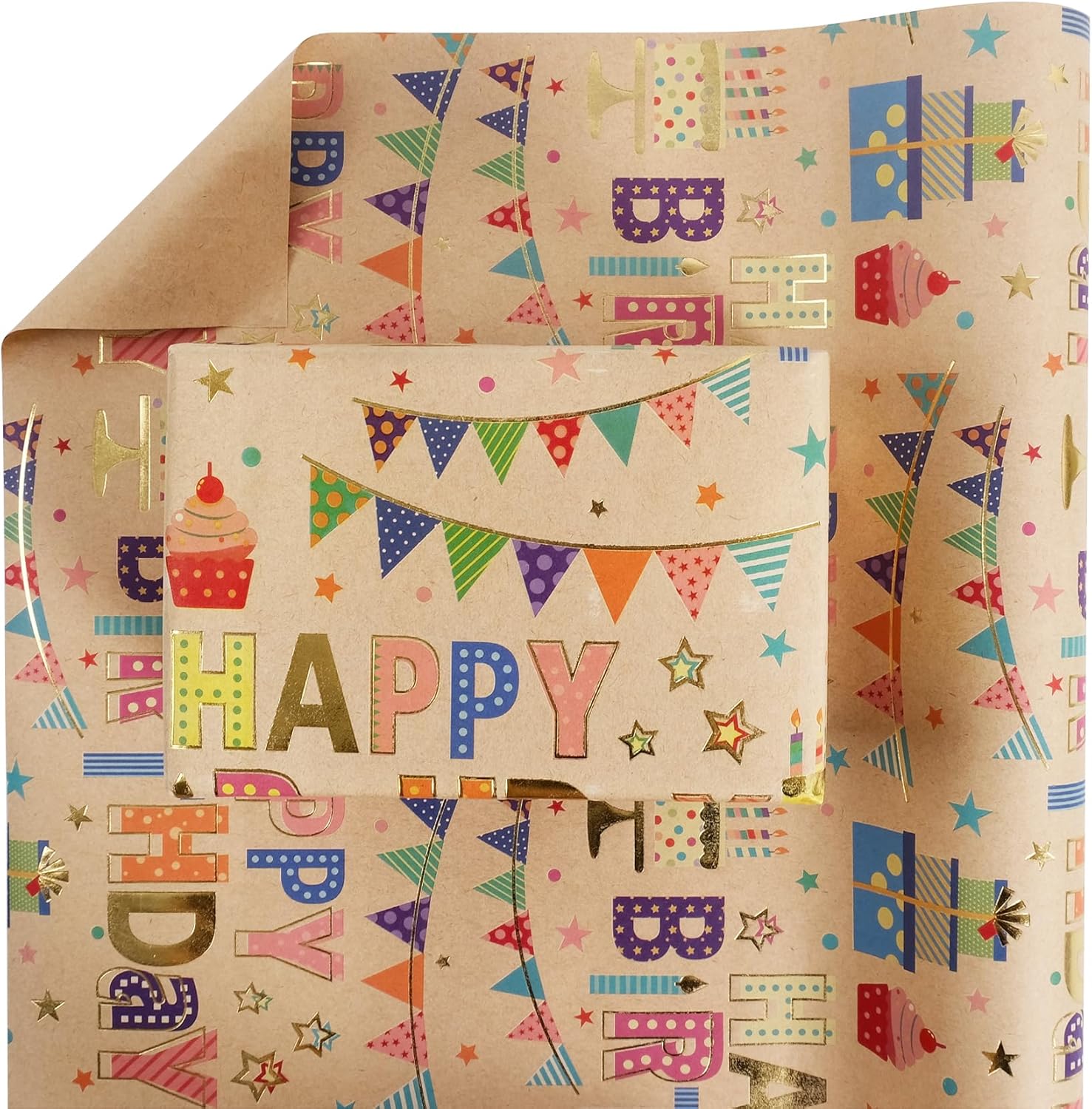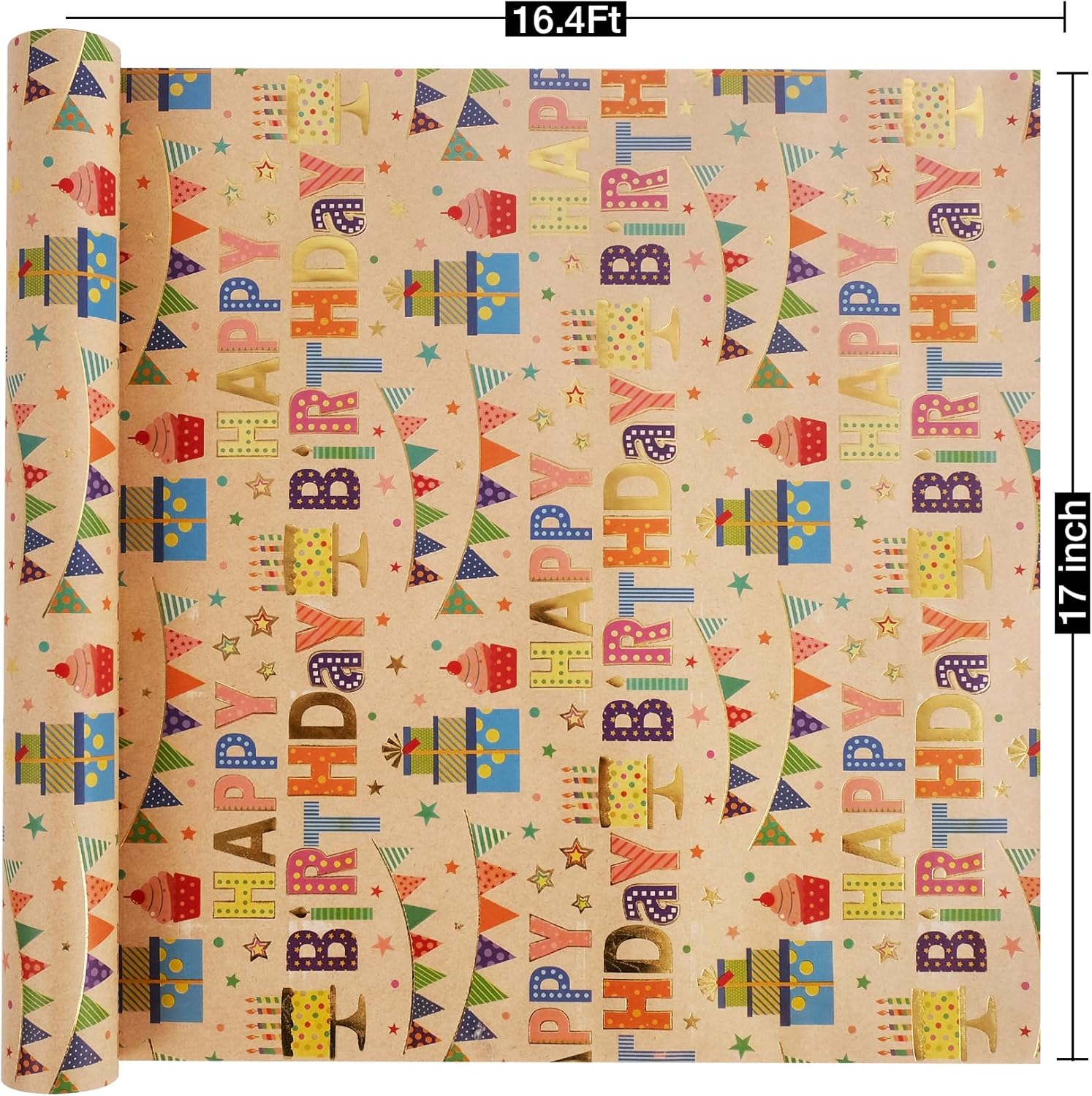 Aimyoo Colorful Birthday Wrapping Paper Roll - 17 Inch X 16.4 Feet - Gold Foil Happy Birthday Lettering, Cupcake & Flags Design Gift Wrap for Kids, Baby Showers