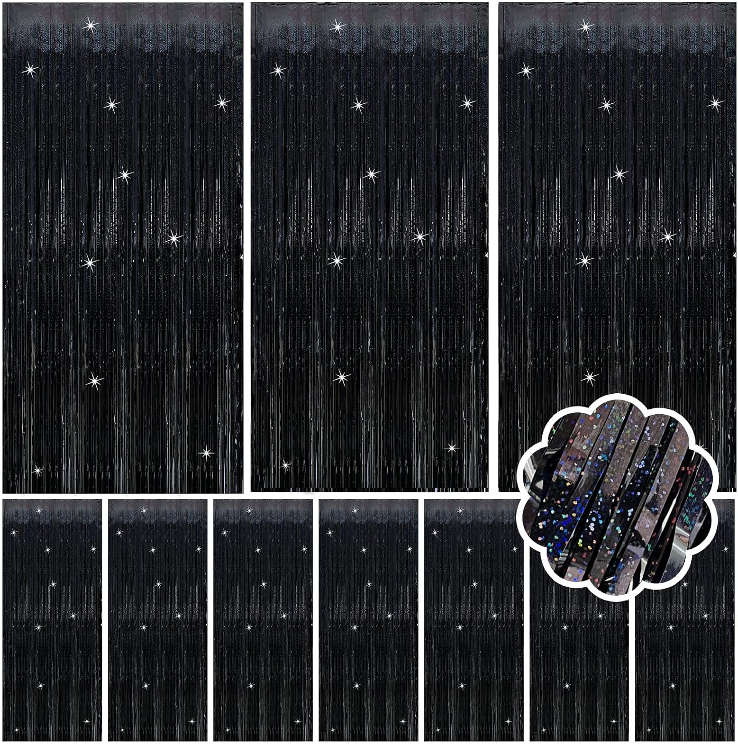 - Black Steamers Set (10-Pack): Each dazzling curtain measures 3.28ft x 6.56ft – perfect for doors, walls, or photo booths! These extra-long foil streamers instantly transform any space into a party-ready celebration zone. Mix, layer, and customize your decor for the best results.