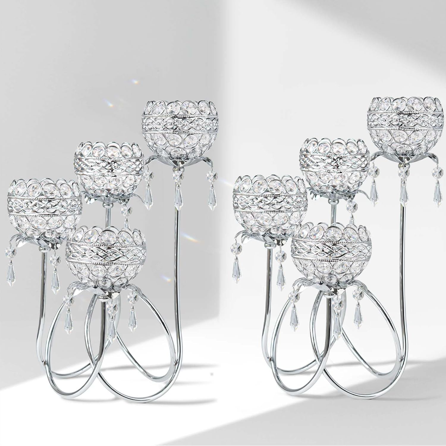 - Dazzling Crystal Bowls & Pendants:Each arm holds a 3.9-inch (10cm) wide crystal bowl with a 1.8-inch (4.5cm) inner tray, designed to securely fit standard tealights while shimmering glass pendants refract light into radiant patterns across your room.