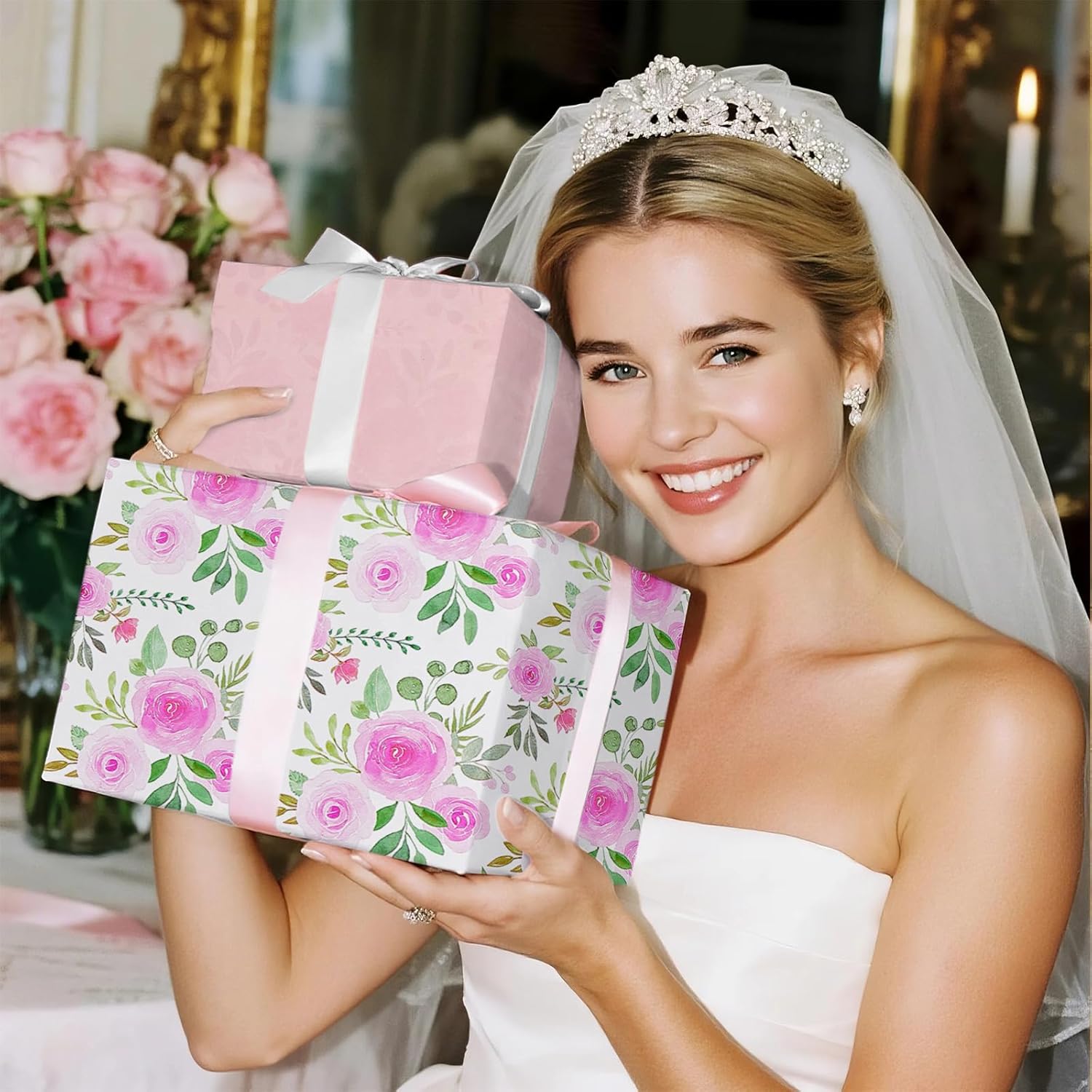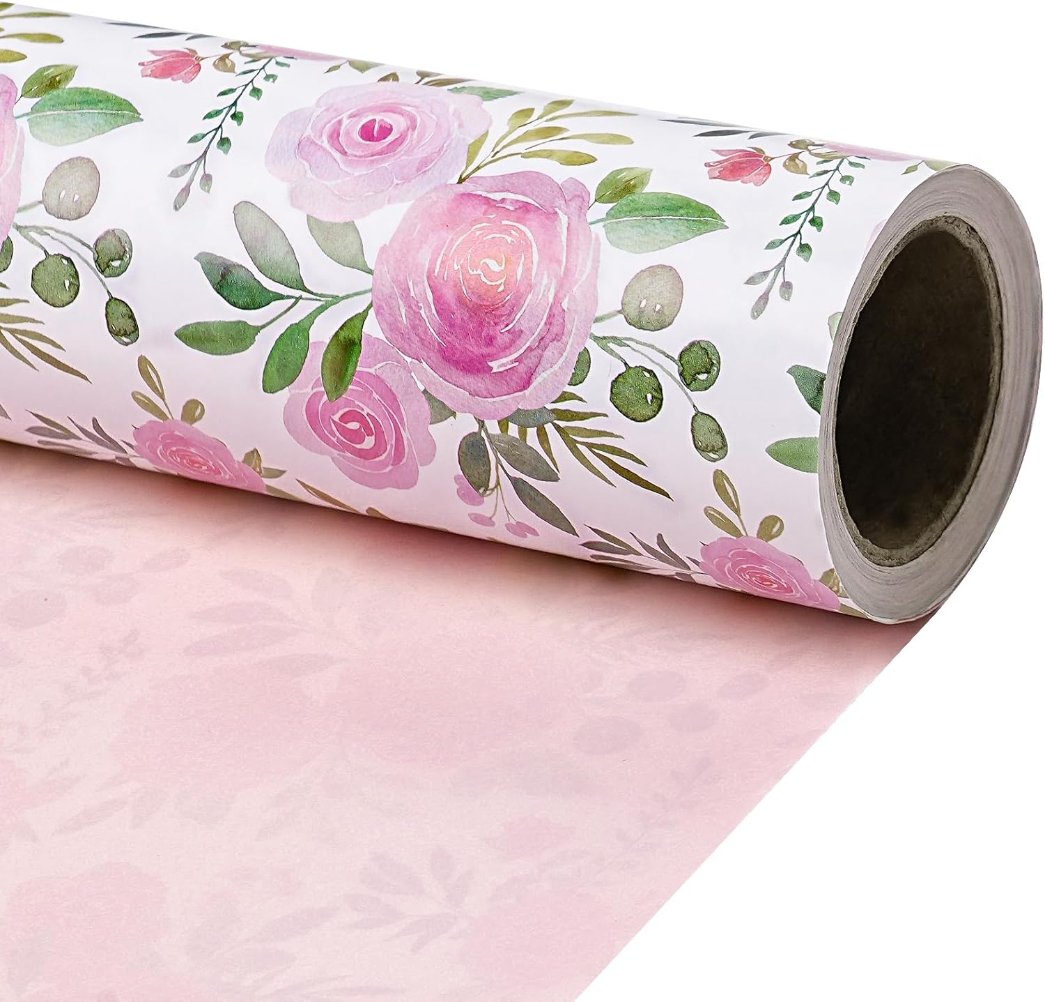 RUSPEPA Reversible Floral Wrapping Paper Roll, Mini Roll, Pink Rose Blossom Design and Pink Solid Color, Elegant Gift Wrap for Birthday, Wedding, Mother's Day, Bridal Shower, 17 Inches x 16.4 Feet