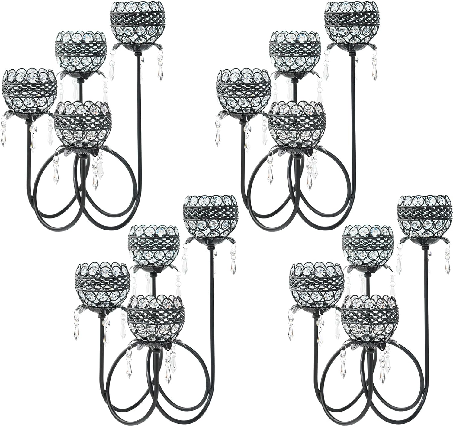 4 Arms Crystal Candelabra Tealight Holder - Tall 15.7 Inch Elegant Centerpiece with Crystal Pendant Bowls & Artistic Metal Stand for Wedding, Dining Table, Home Decor (4, Black)