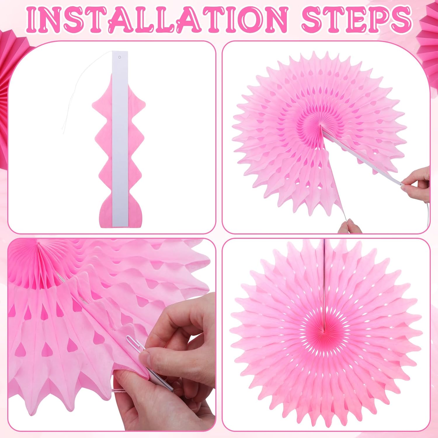- Easy to Assemble and Durable: simply unfold each Tissue paper fan and secure with a paper clip; If you apply the clip to fix the fan, you can reapply the fans for future parties