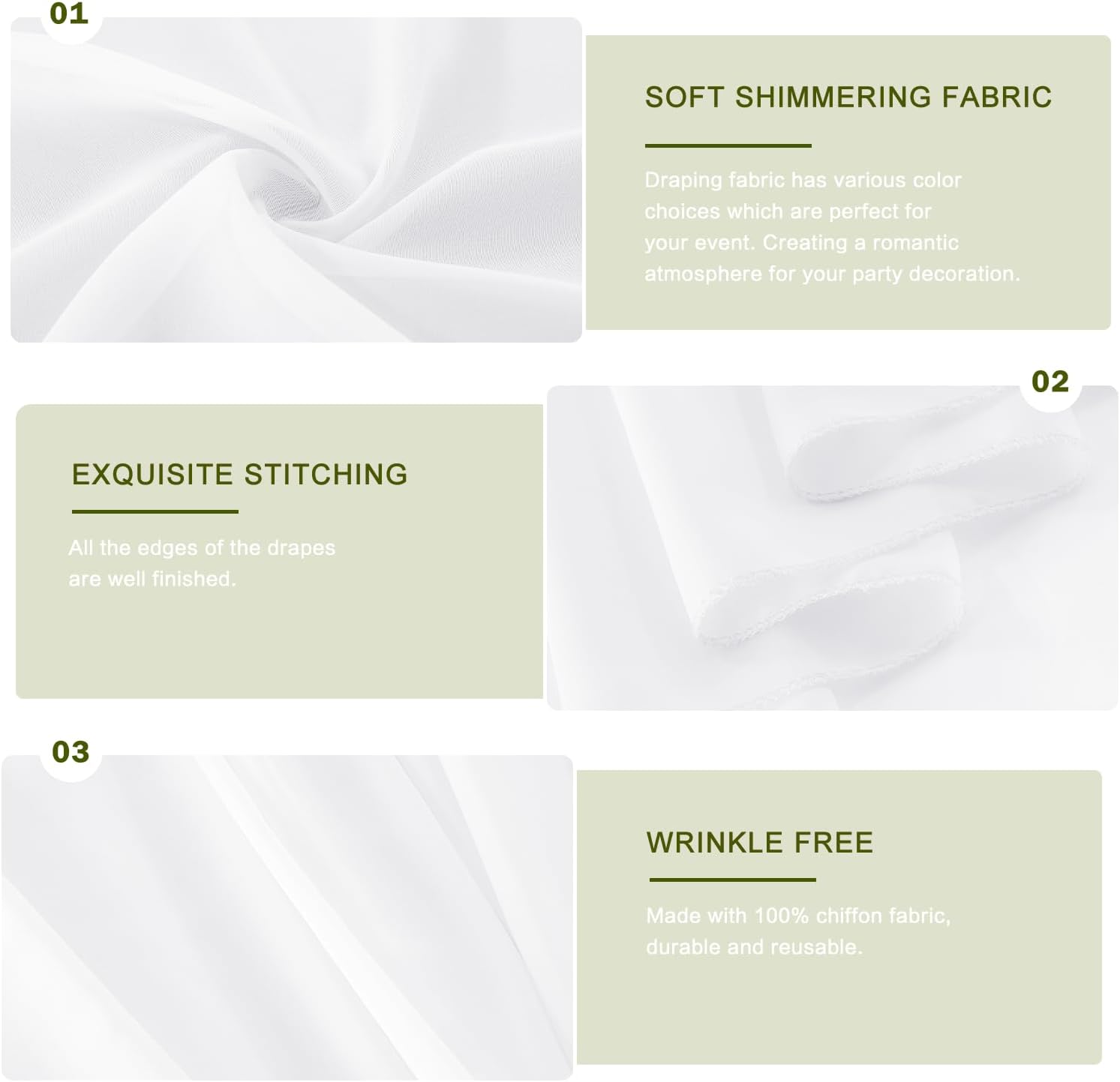 - Romantic Decor: These wedding arch drapes are good choice for any size of Arch, Canopy, Chuppah, Arbor or Altars. Also, you can hung flowers, ribbons, strings of pearls on these arch draping to decor your weeding or party more elegant.